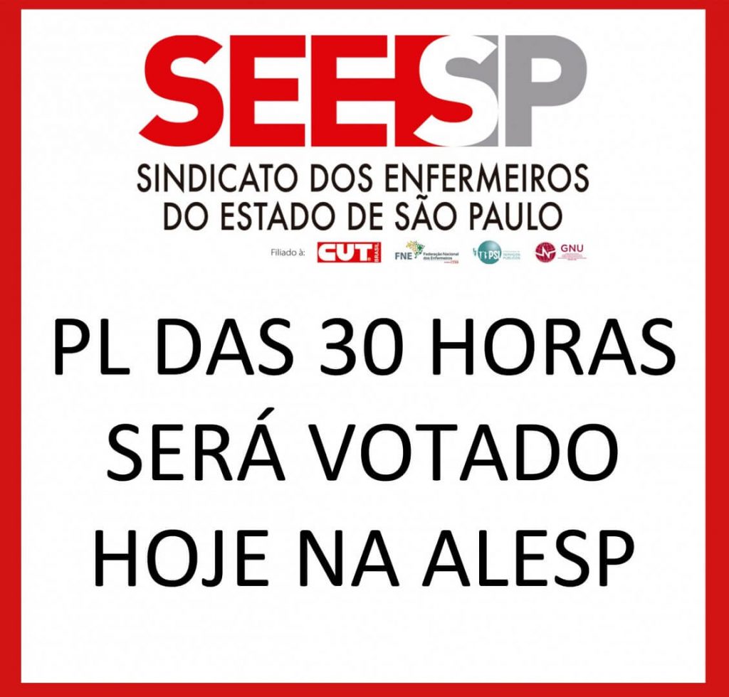 O Sindicato dos Enfermeiros do Estado de São Paulo (SEESP) pede a presença de toda a ENFERMAGEM PAULISTA na Assembleia Legislativa de São Paulo (ALESP) nesta quarta-feira (18), a partir das 16h30, para cobrar dos deputados a aprovação do PROJETO DE LEI (PL) 347/2018, de autoria da deputada Analice Fernandes, que REGULAMENTA A JORNADA DE 30 HORAS SEMANAIS para a enfermagem no estado de São Paulo, sem redução salarial.
