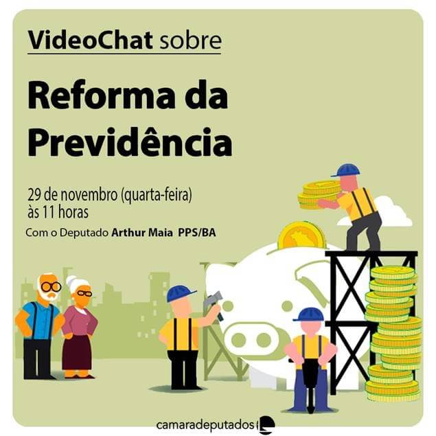 Informamos que nesta quarta-feira, dia 29, às 11h, a Coordenação de Participação Popular da Câmara dos Deputados promove um videochat, pela internet, para que os cidadãos possam discutir sobre a PEC 287/2016, que fala sobre a Reforma da Previdência.