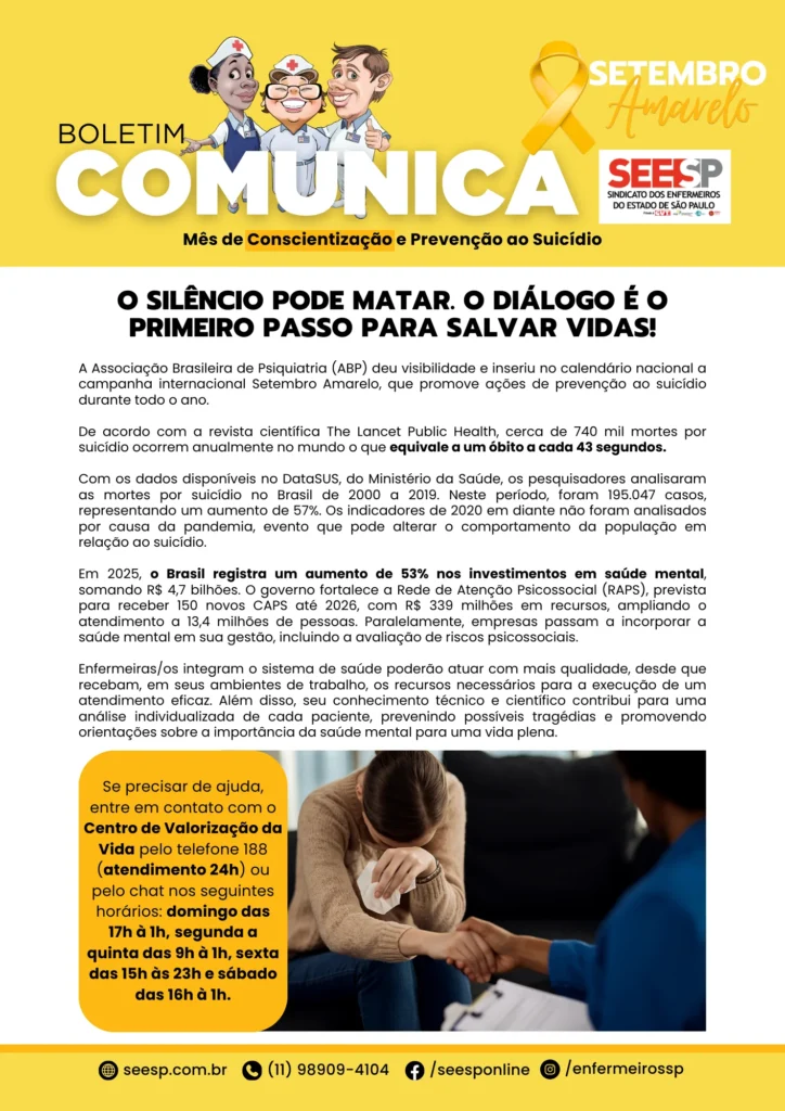 Com a estatística global alarmante de que um suicídio ocorre a cada 43 segundos, a campanha “Setembro Amarelo” reforça a urgência do debate sobre saúde mental e prevenção. No Brasil, dados do DataSUS mostram um aumento de 57% no número de mortes por suicídio entre 2000 e 2019, totalizando mais de 195 mil casos no período, um cenário que exige que o silêncio seja quebrado pelo diálogo para salvar vidas.